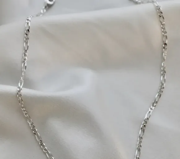 This necklace is a shimmering figaro chain in silver. It sits beautifully by itself or layered with other chains to create a dimensional look.